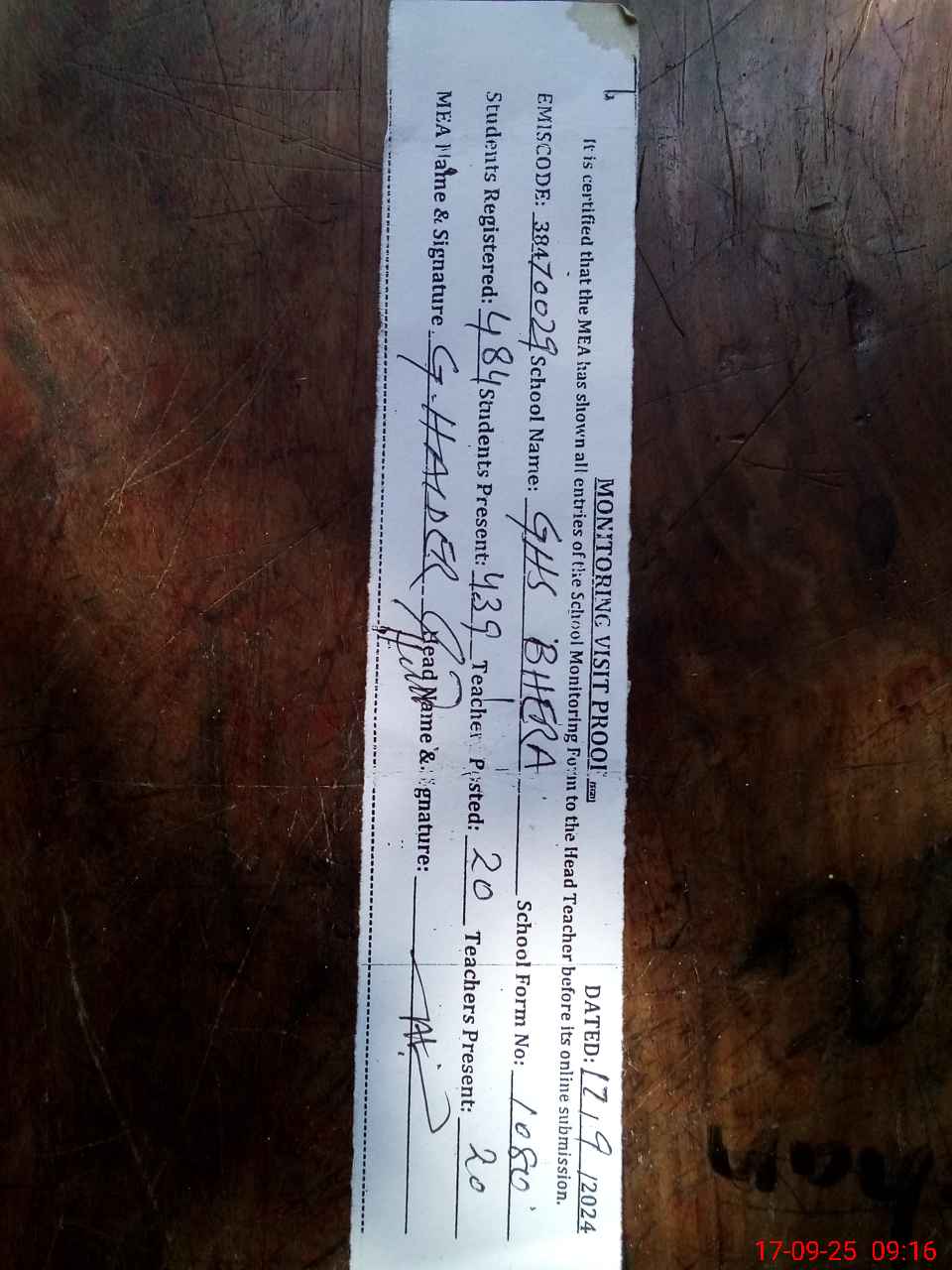 | Attendance Register | Head Teacher | MEA with School | Visit Proof |