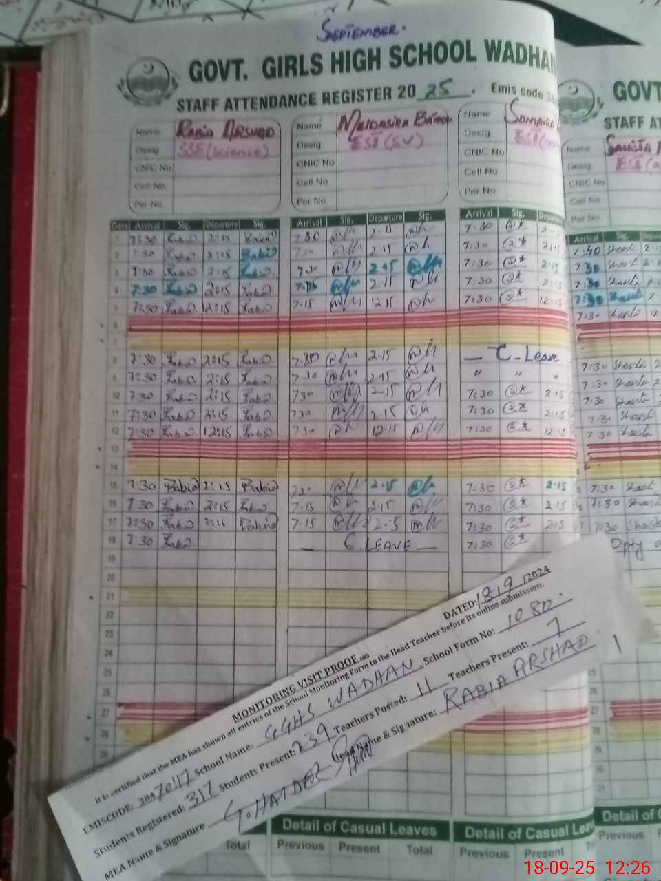 | Remarks (Use Separate Page if Required): BARJEES KHANAM IS ON IDDAT LEAVE BUT DUE TO NNO KALAM I SHOW HIM IN EARNED LEAVE OTHER 3 TEACHERS ARE ABSENT NO LEAVES PROOF PROVIDED AND THEIR ATTENDANCE KALAM WERE LYING BLANK | |||||
