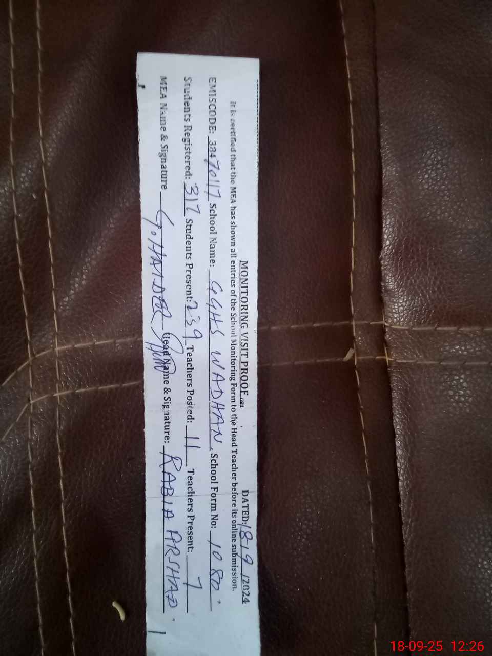 | Attendance Register | Head Teacher | MEA with School | Visit Proof |