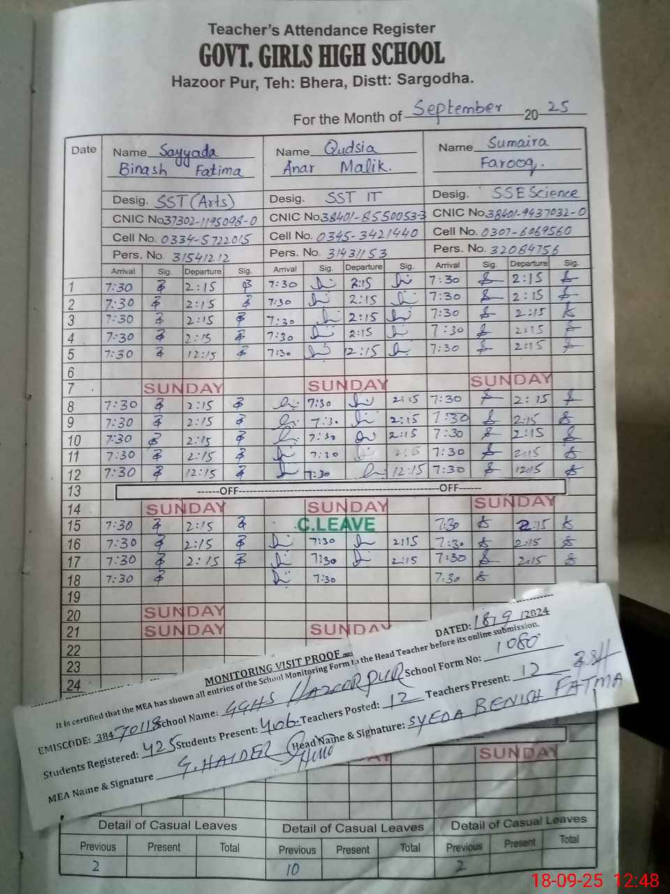 | CNIC | Full Name | Designation | R/C | Absence During Last Calender Month |