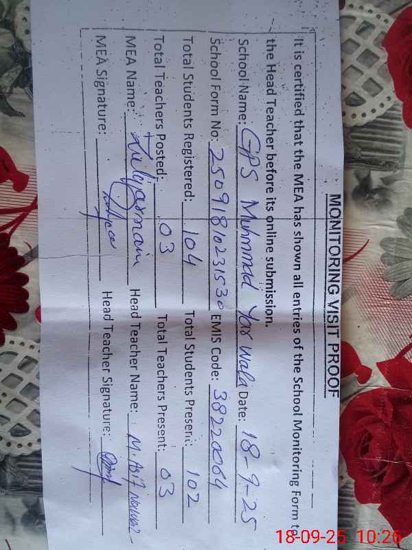 | EMIS Code: 38220064 | Name of School: GPS MUHAMMAD YAR WALA | |||