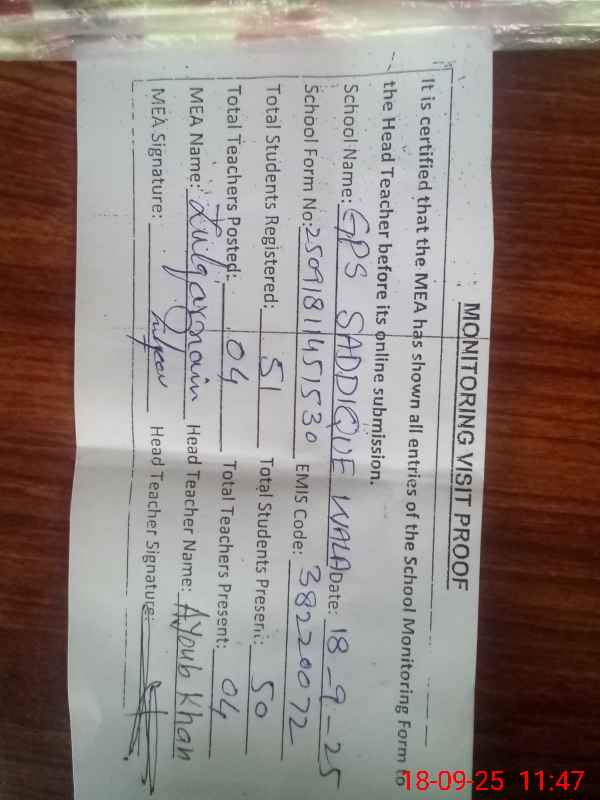 | EMIS Code: 38220072 | Name of School: GPS SIDDIQUE WALA | |||