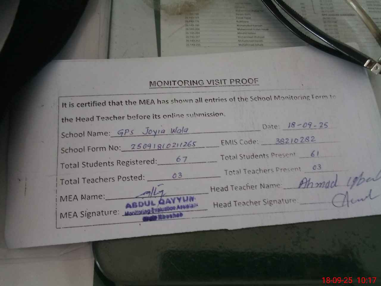 | Attendance Register | Head Teacher | MEA with School | Visit Proof |