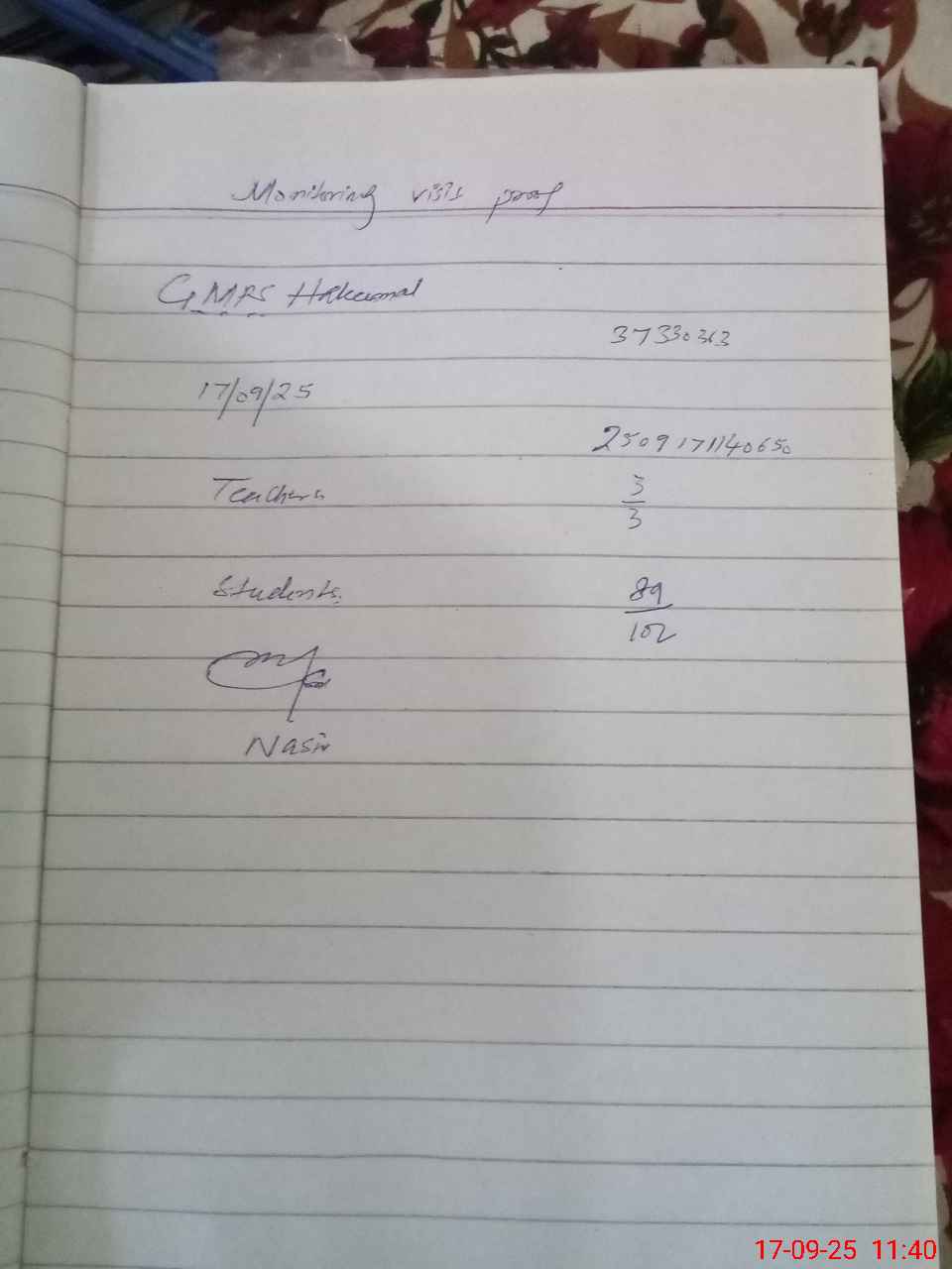 | Attendance Register | Head Teacher | MEA with School | Visit Proof |
