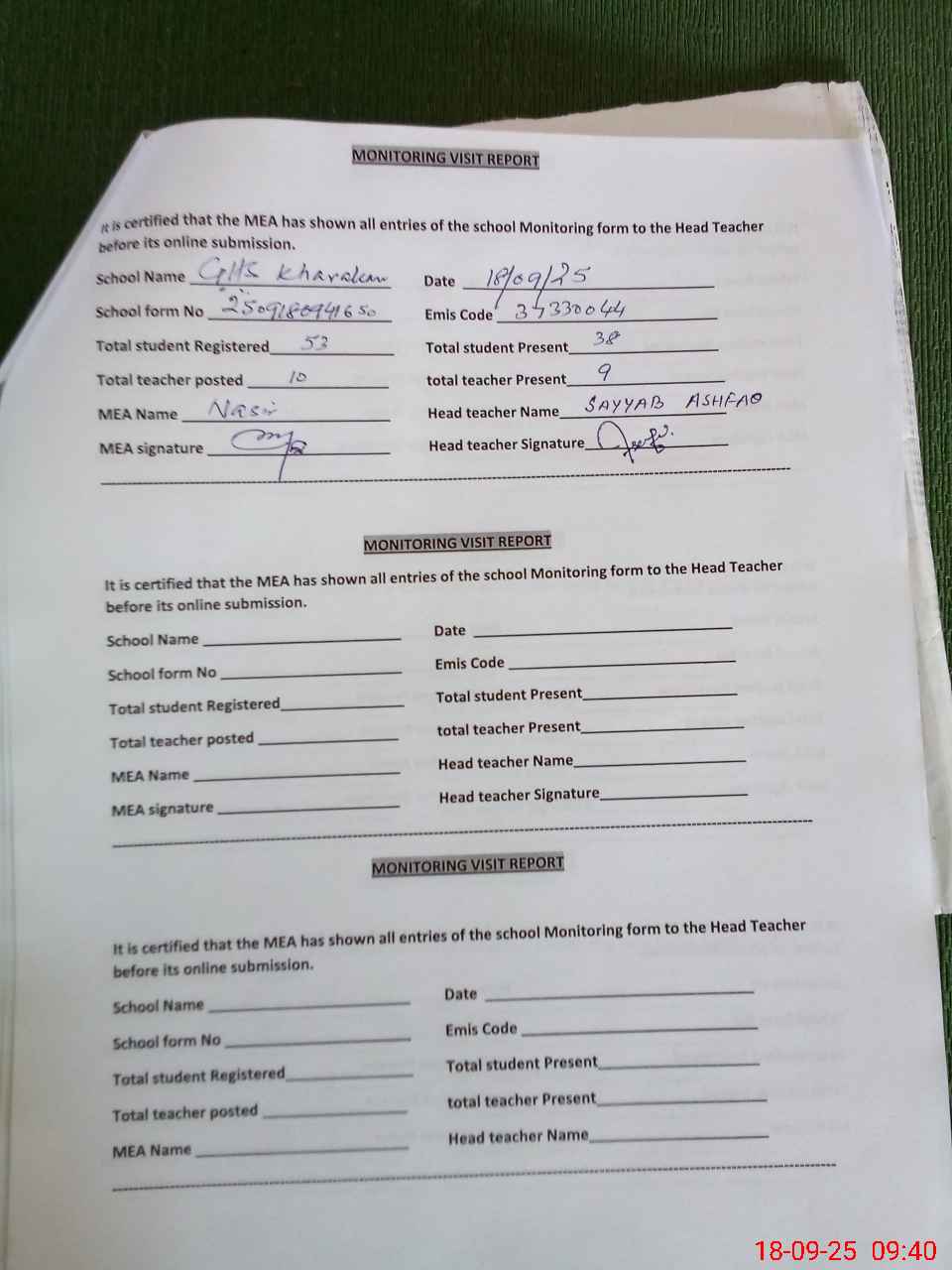 | Attendance Register | Head Teacher | MEA with School | Visit Proof |