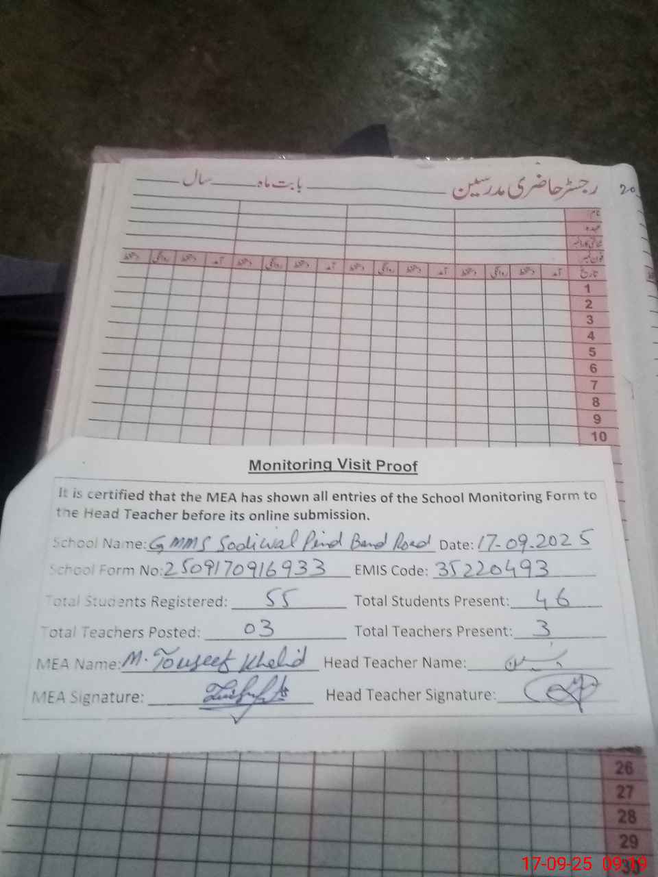 | EMIS Code: 35220493 | Name of School: GMMS SODIWAL PIND BAND ROAD LAHORE | |||