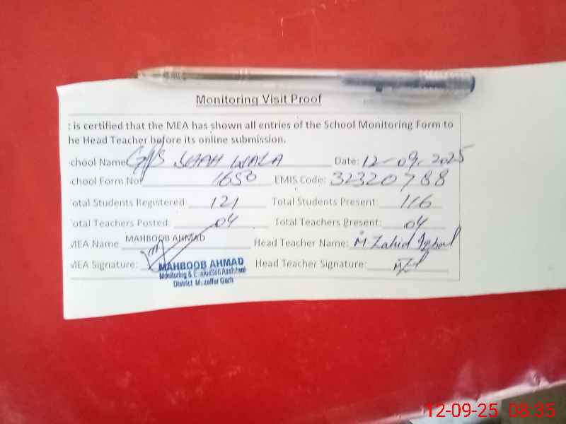 | EMIS Code: 32320788 | Name of School: GPS SHAH WALA | |||