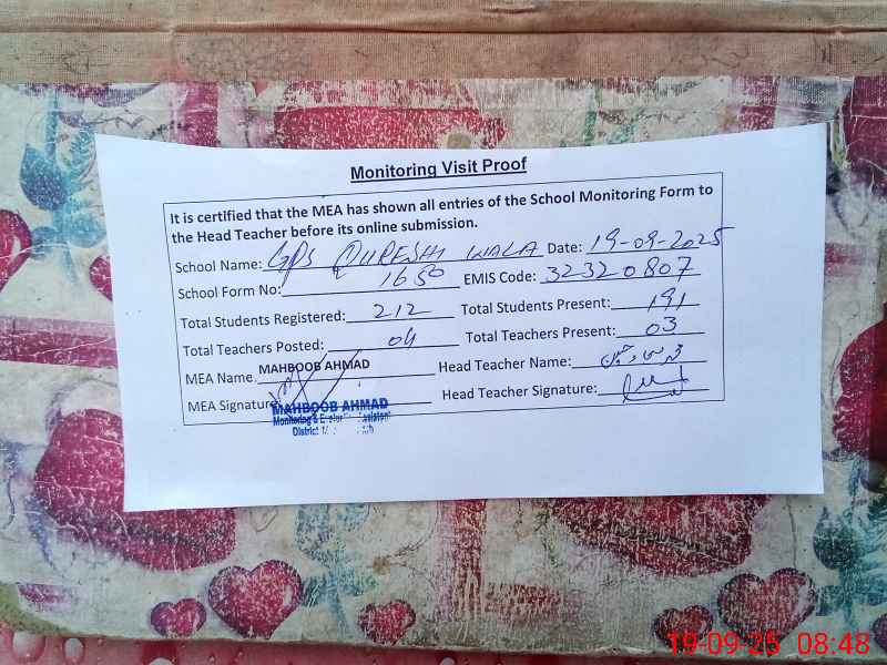 | EMIS Code: 32320807 | Name of School: GPS QURESHI WALA | |||