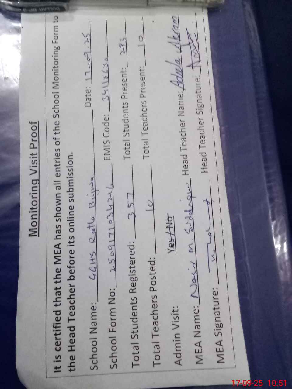 | EMIS Code: 34110630 | Name of School: GGHS RATTA BAJWA | |||