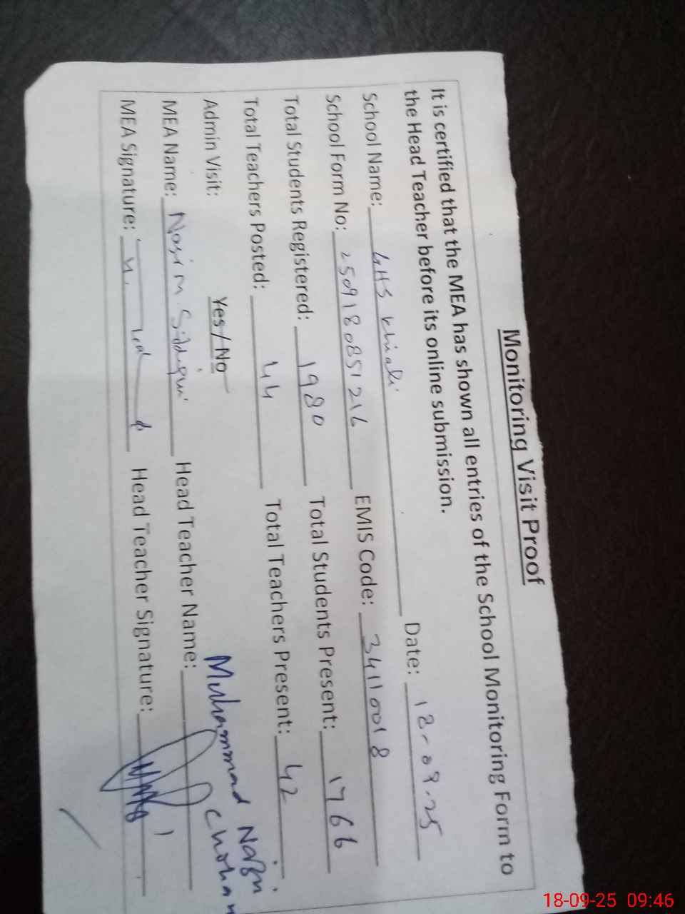 | Attendance Register | Head Teacher | MEA with School | Visit Proof |