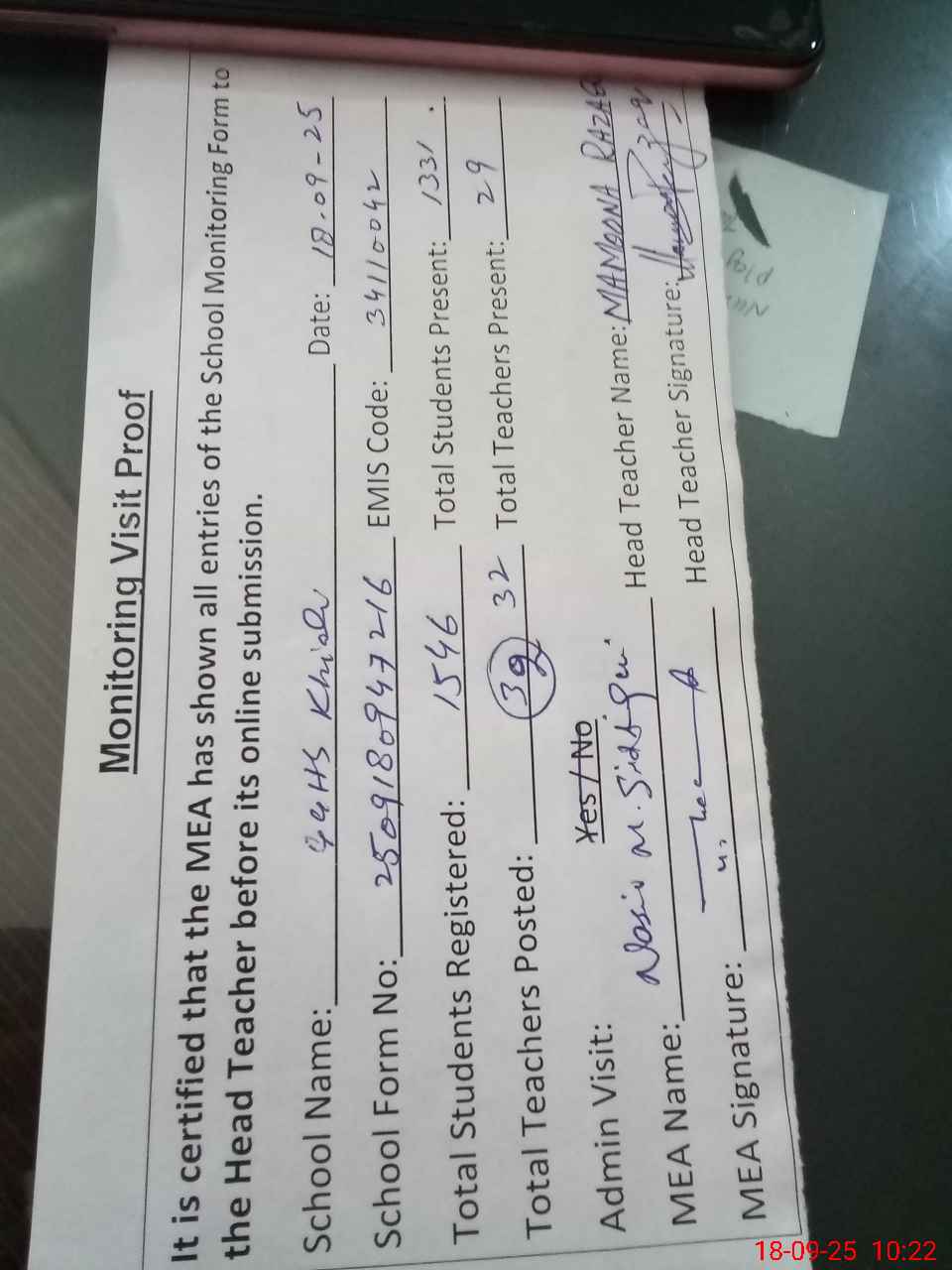 | Attendance Register | Head Teacher | MEA with School | Visit Proof |