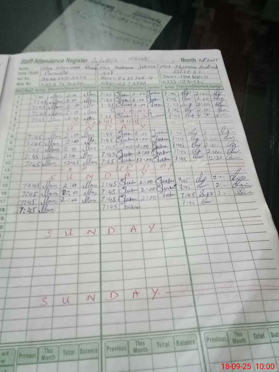 | CNIC | Full Name | Designation | R/C | Absence during last cal. month |