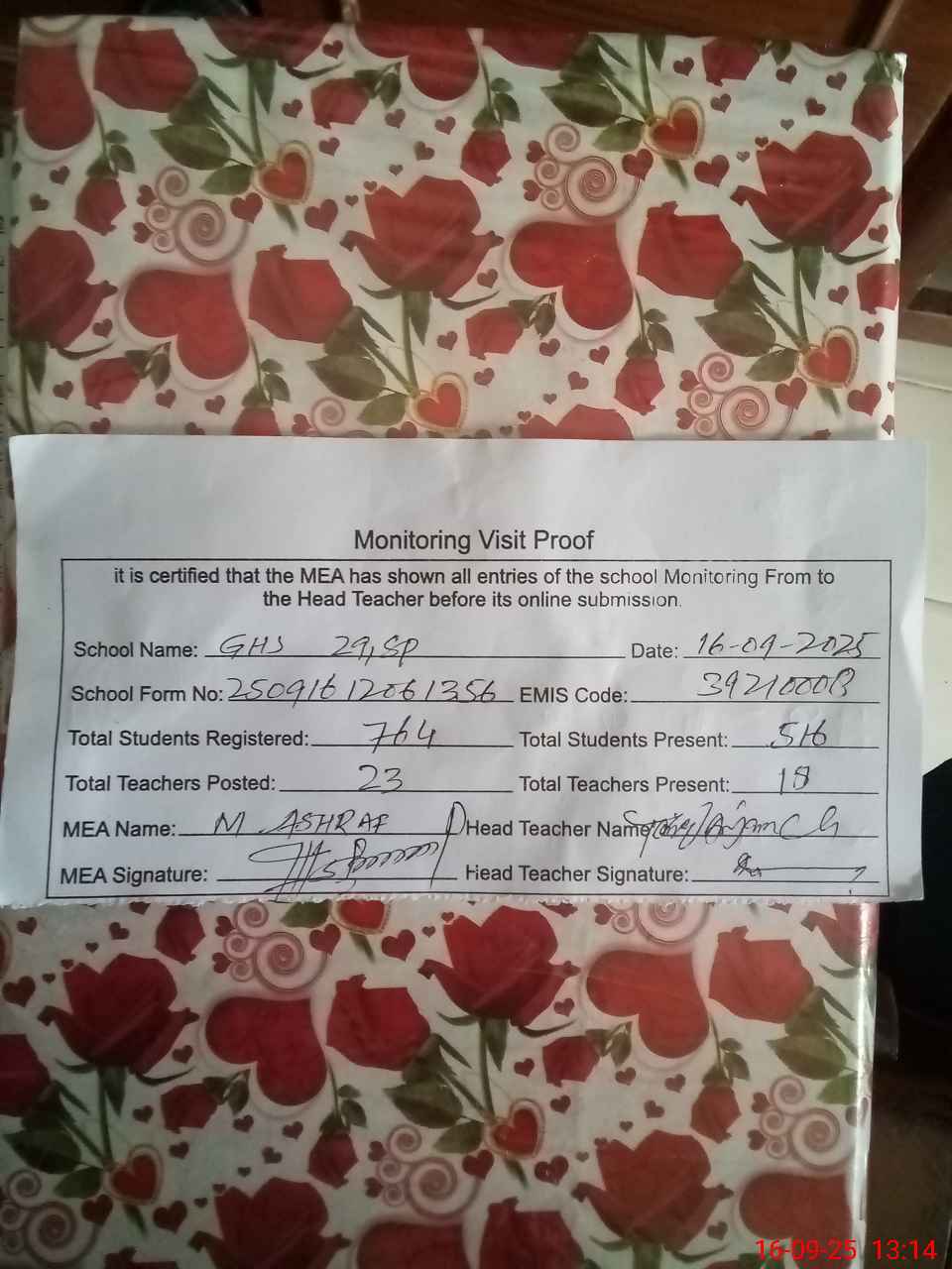 | Attendance Register | Head Teacher | MEA with School | Visit Proof |