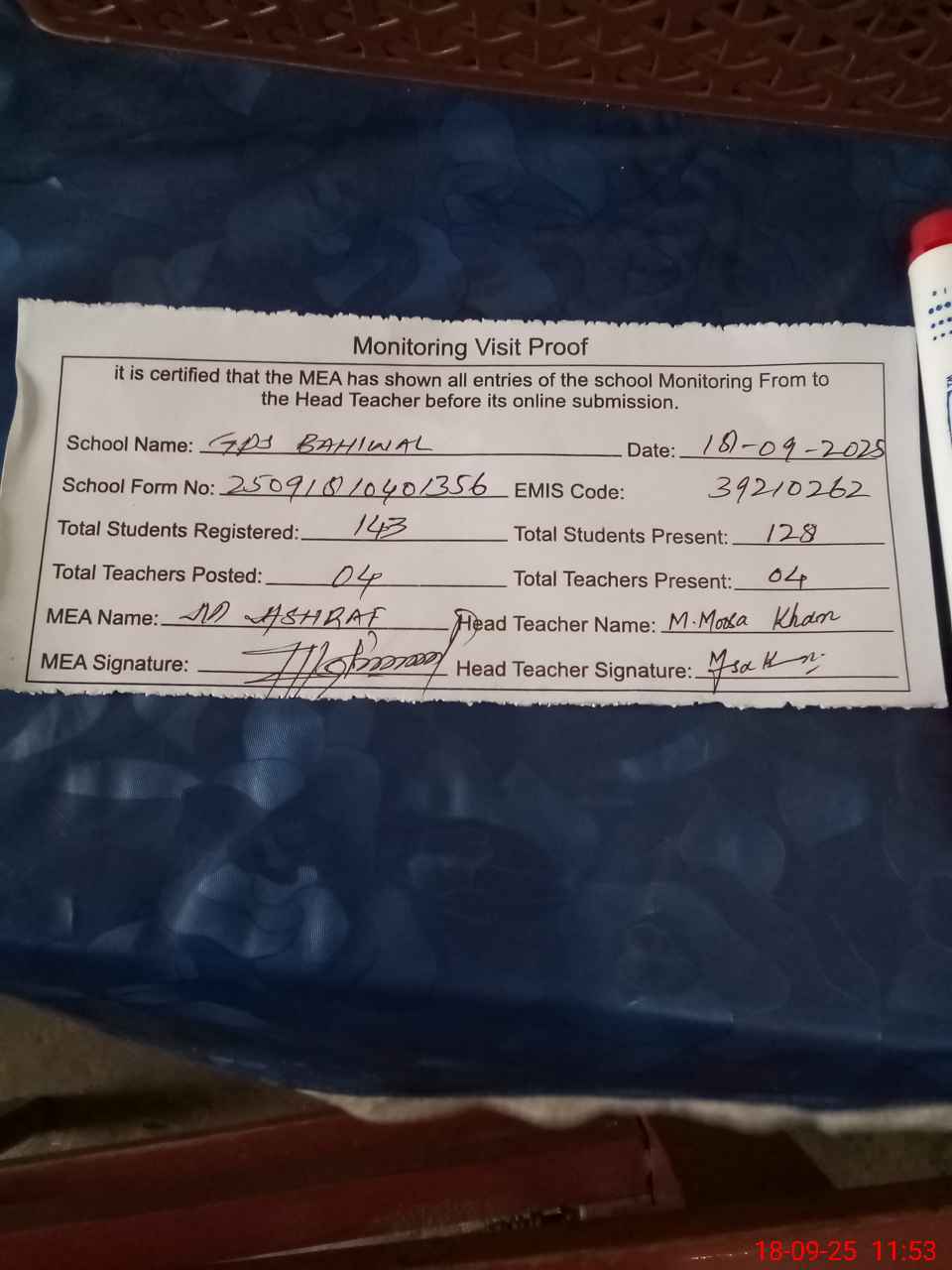 | EMIS Code: 39210262 | Name of School: GPS BAHIWAL | |||