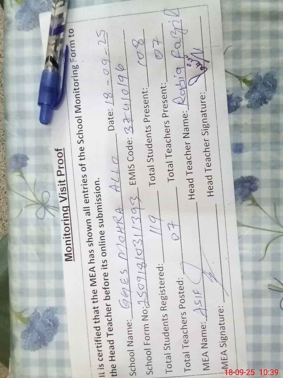 | Attendance Register | Head Teacher | MEA with School | Visit Proof |