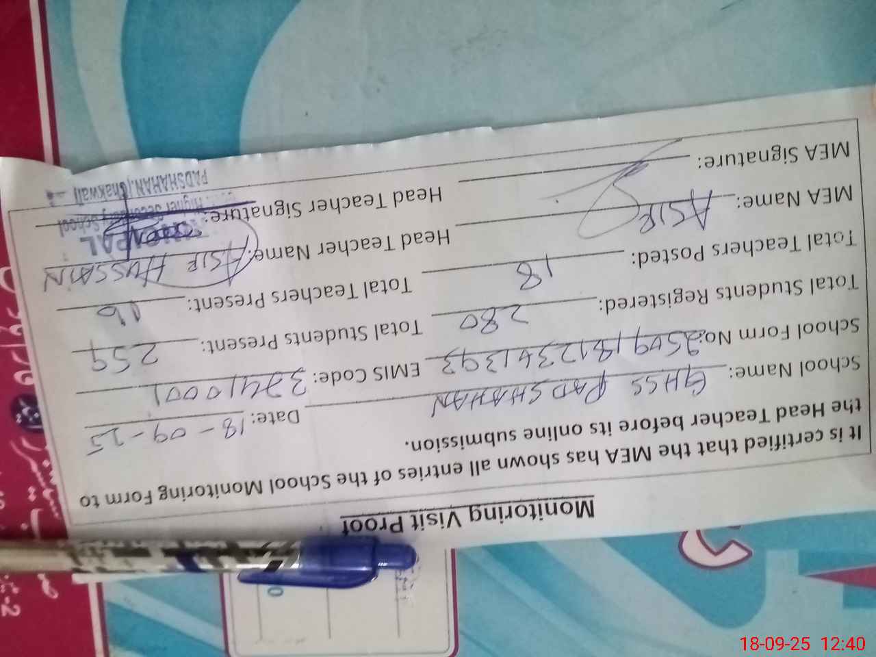 | Certified that this School was Inspected by the Undersigned MEA/DMO Today and the Information Stated Above is as Per Record. | |||||