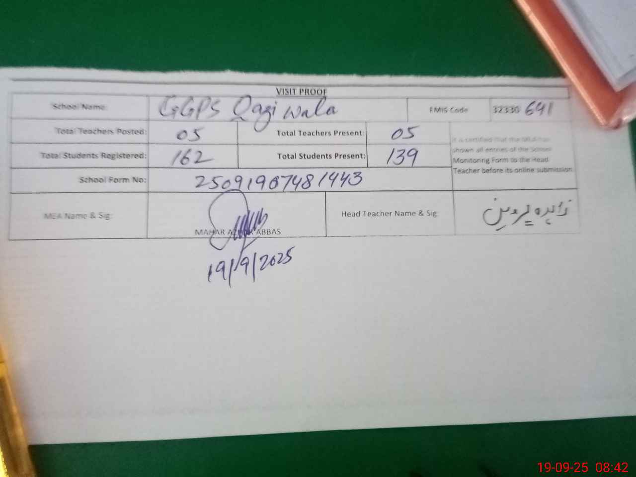 | Attendance Register | Head Teacher | MEA with School | Visit Proof |