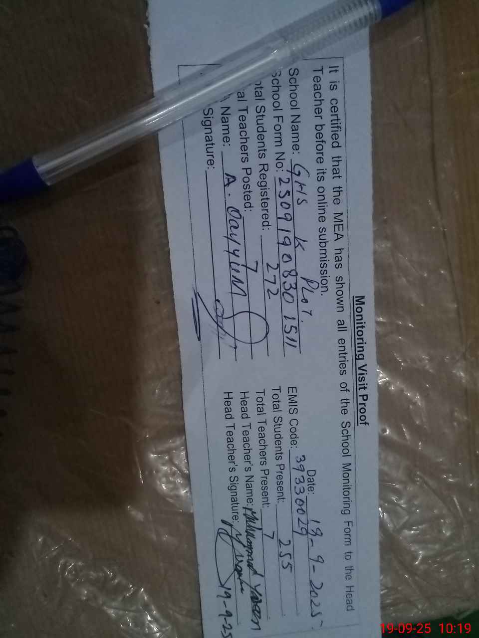 | Name: MU**** IM**** Designation: (School Headmaster's/Headmistress's) HEAD MASTER Phone/Cell Number: 03**** |