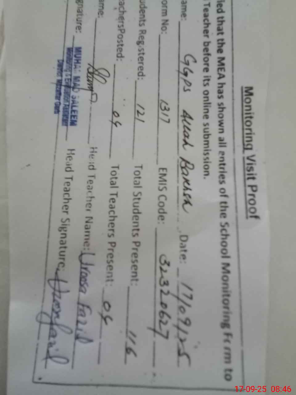 | Attendance Register | Head Teacher | MEA with School | Visit Proof |