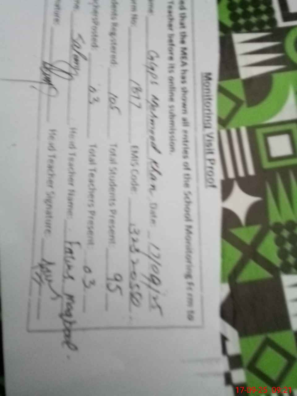 | Name: NA**** BA**** Designation: (School Headmaster's/Headmistress's) PST Phone/Cell Number: 03**** |