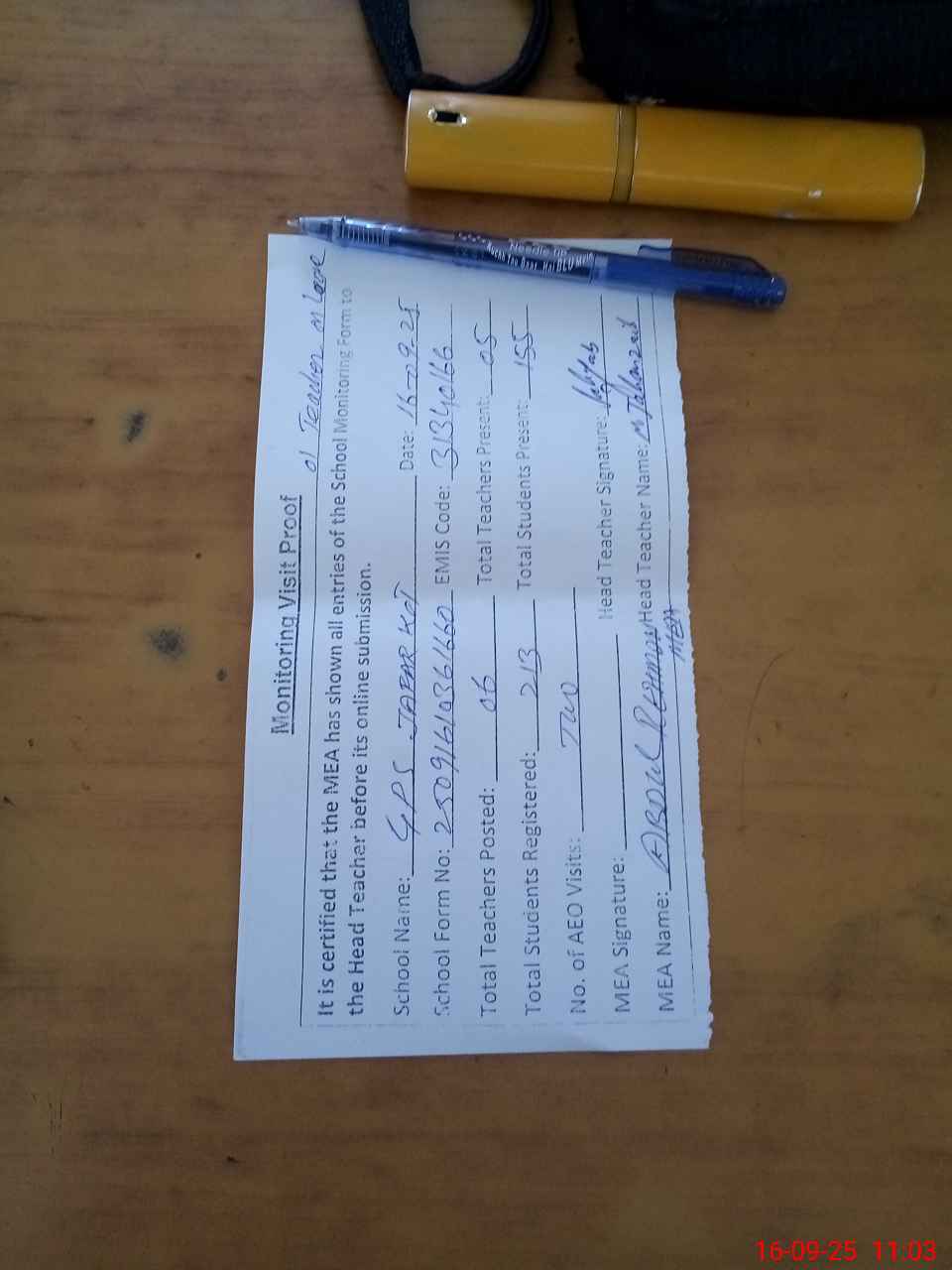 | Attendance Register | Head Teacher | MEA with School | Visit Proof |