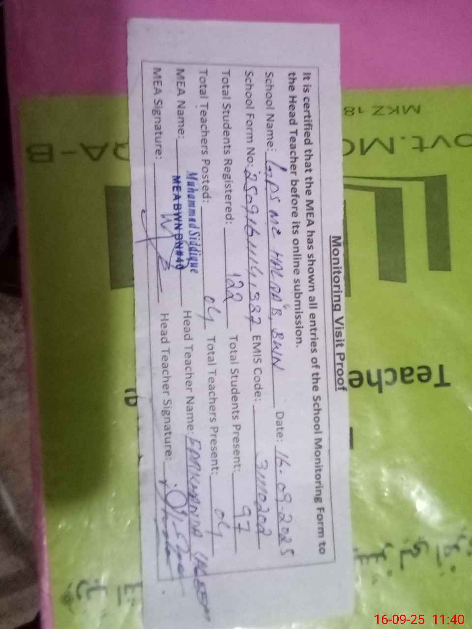 | Attendance Register | Head Teacher | MEA with School | Visit Proof |