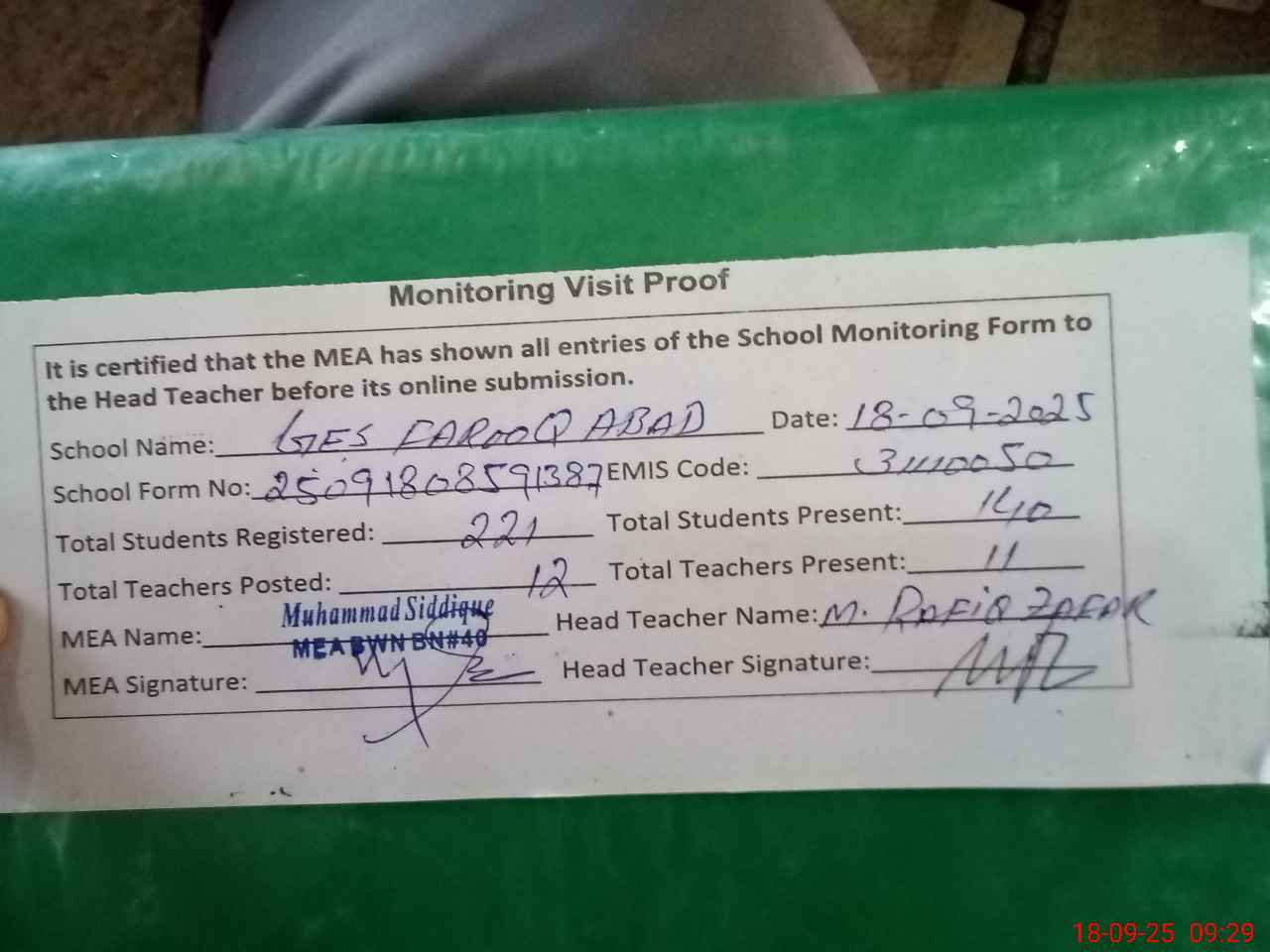 | EMIS Code: 31110050 | Name of School: GES FAROOQ ABAD | |||