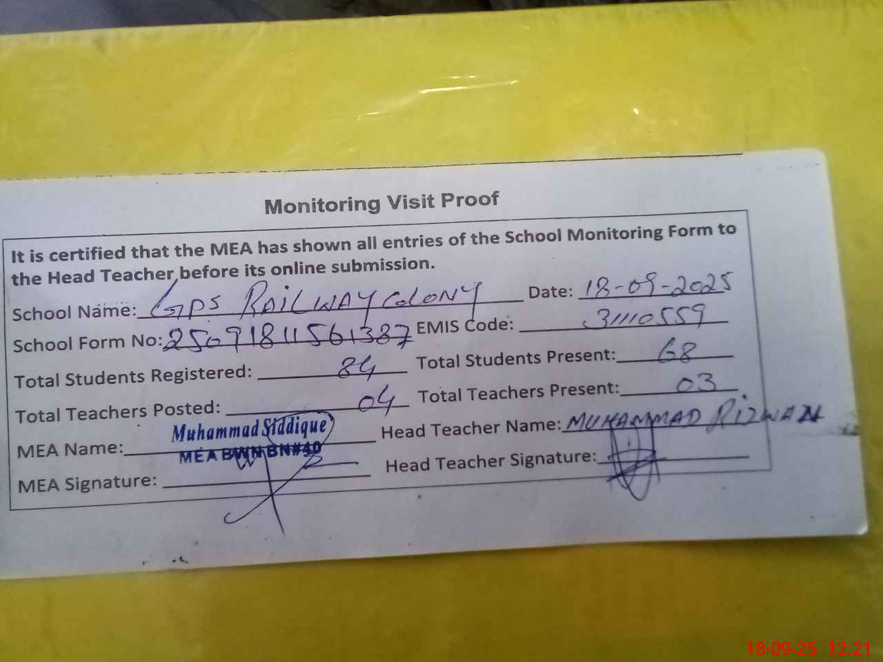| Attendance Register | Head Teacher | MEA with School | Visit Proof |
