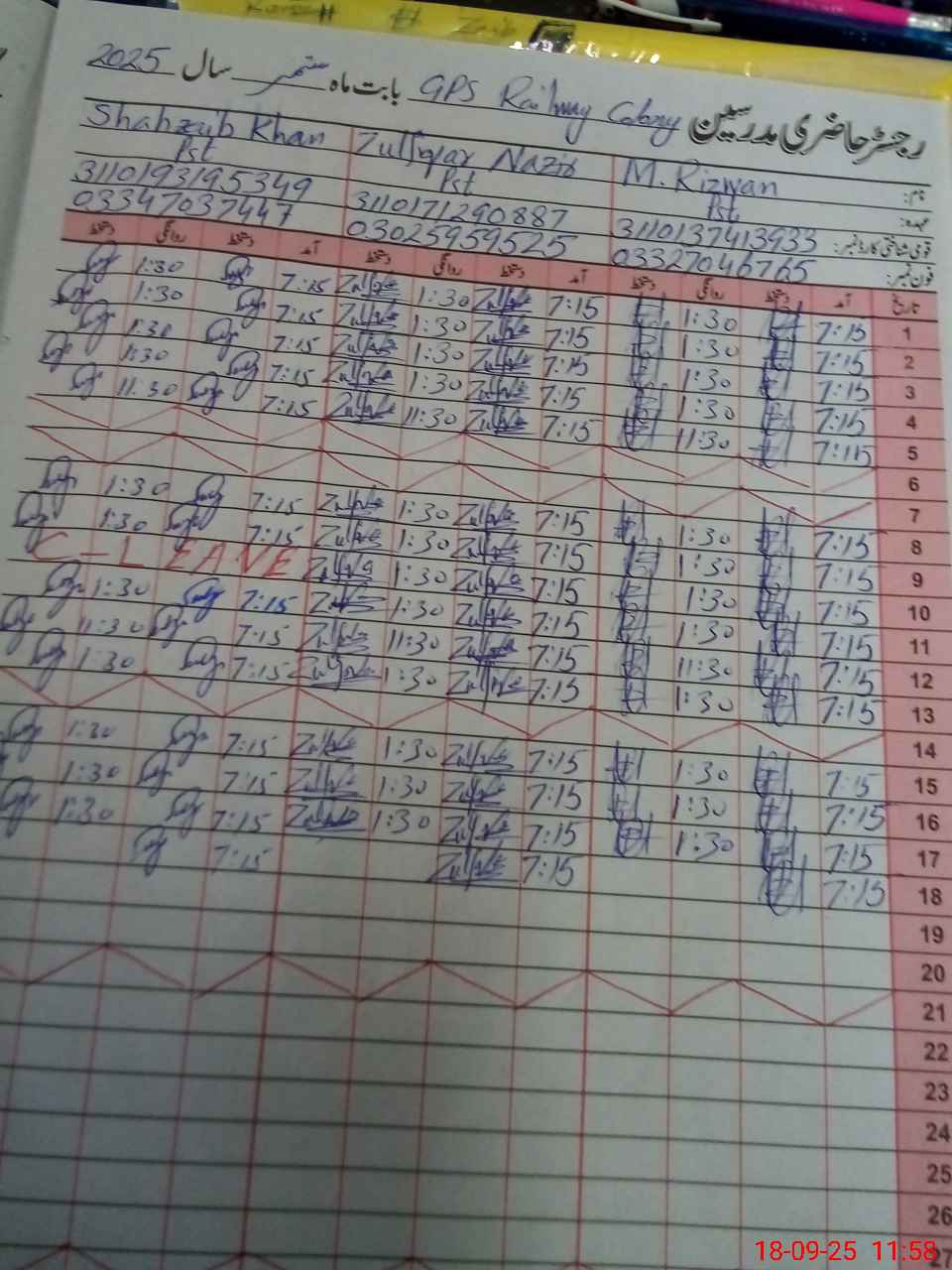 | CNIC | Full Name | Designation | R/C | Absence during last cal. month |