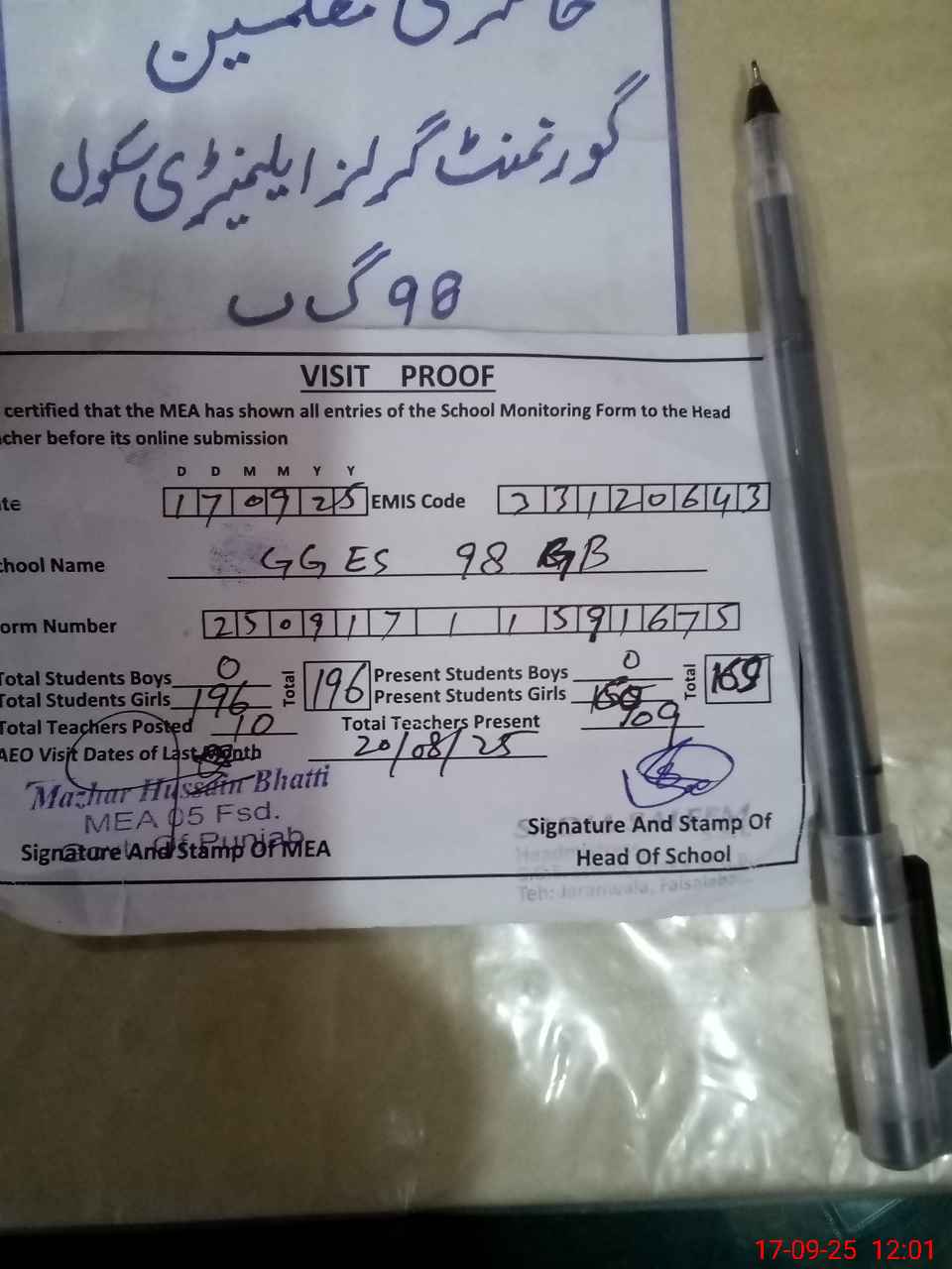| EMIS Code: 33120643 | Name of School: GGES CHAK NO 98 GB | |||