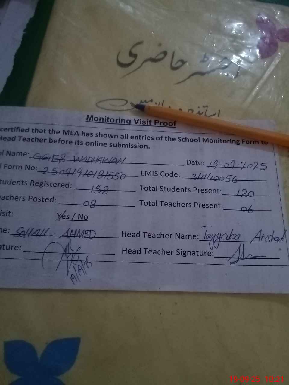 | Attendance Register | Head Teacher | MEA with School | Visit Proof |