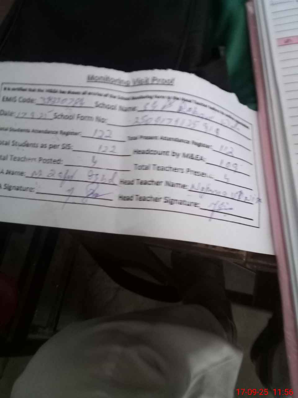 | Attendance Register | Head Teacher | MEA with School | Visit Proof |