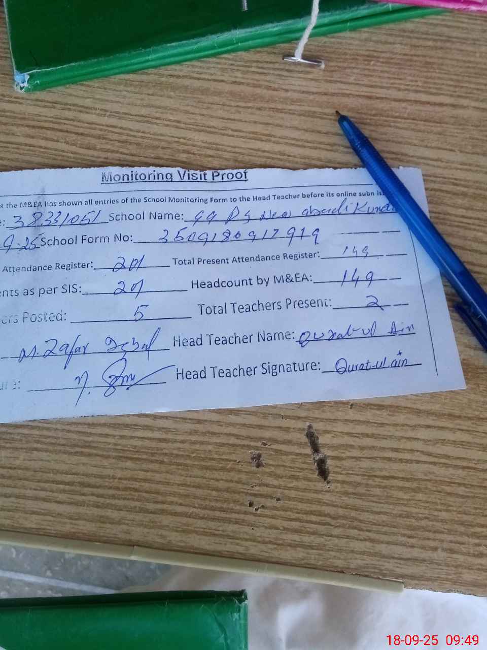 | Attendance Register | Head Teacher | MEA with School | Visit Proof |