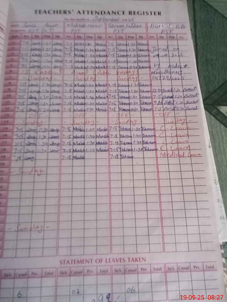 | Remarks (Use Separate Page if Required): Barkat bibi pst on medical leave but no online show absent | |||||
