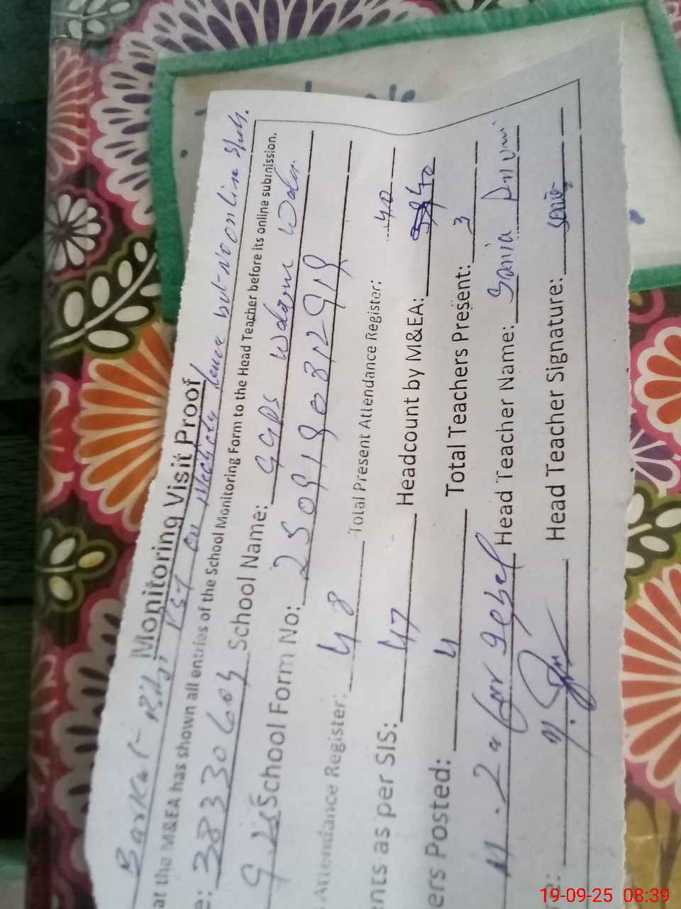 | Attendance Register | Head Teacher | MEA with School | Visit Proof |