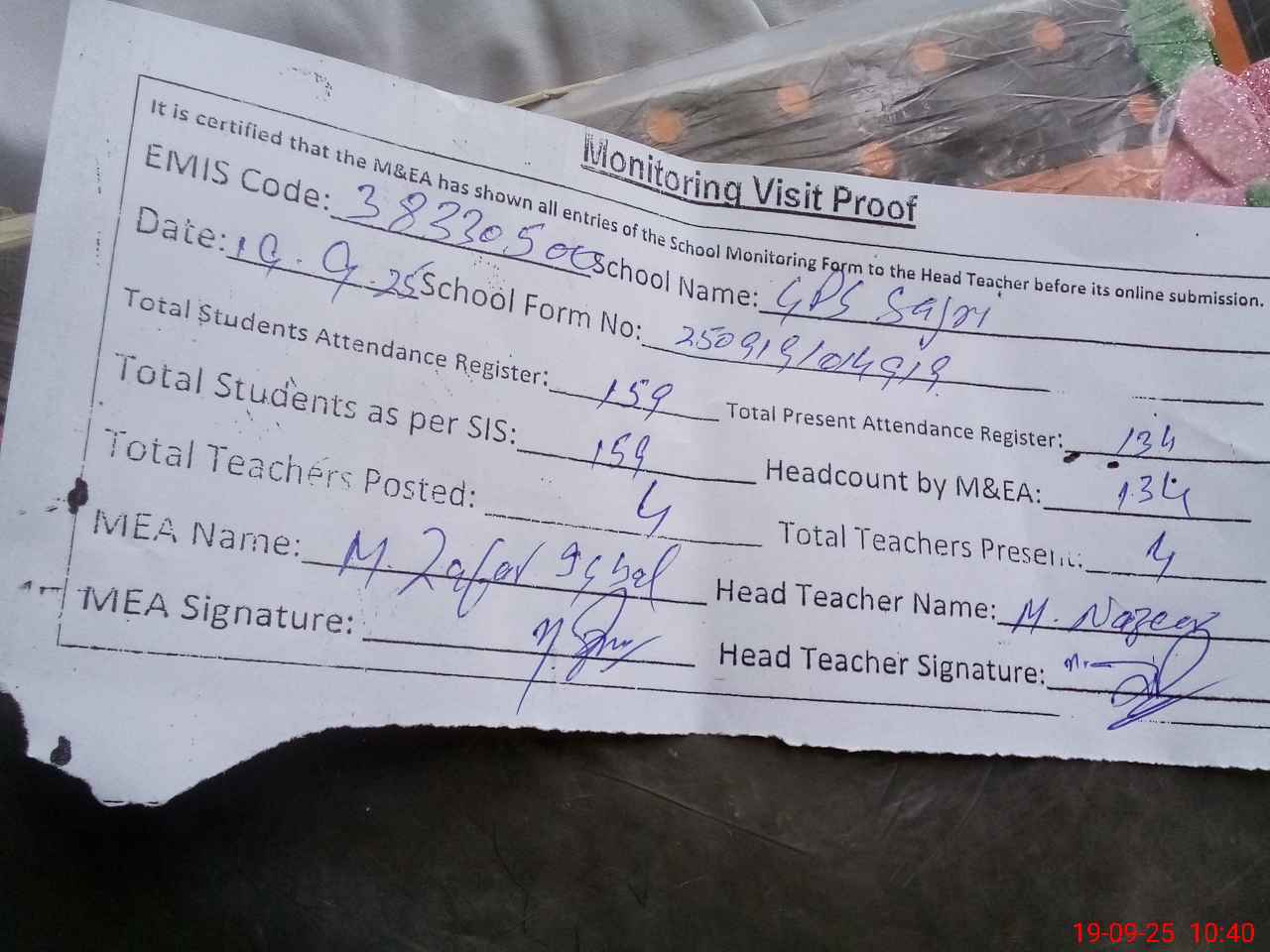 | Attendance Register | Head Teacher | MEA with School | Visit Proof |