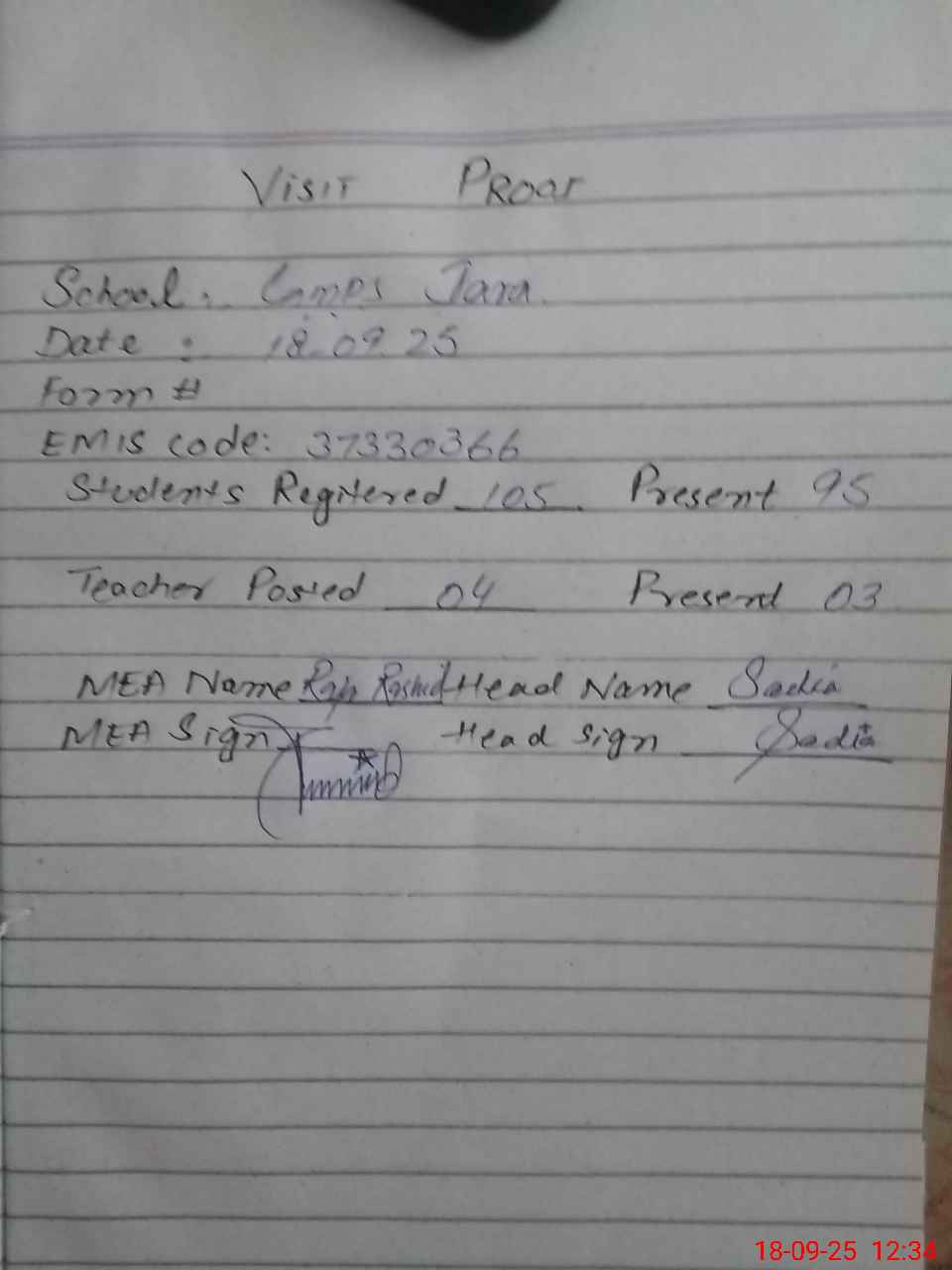 | Attendance Register | Head Teacher | MEA with School | Visit Proof |