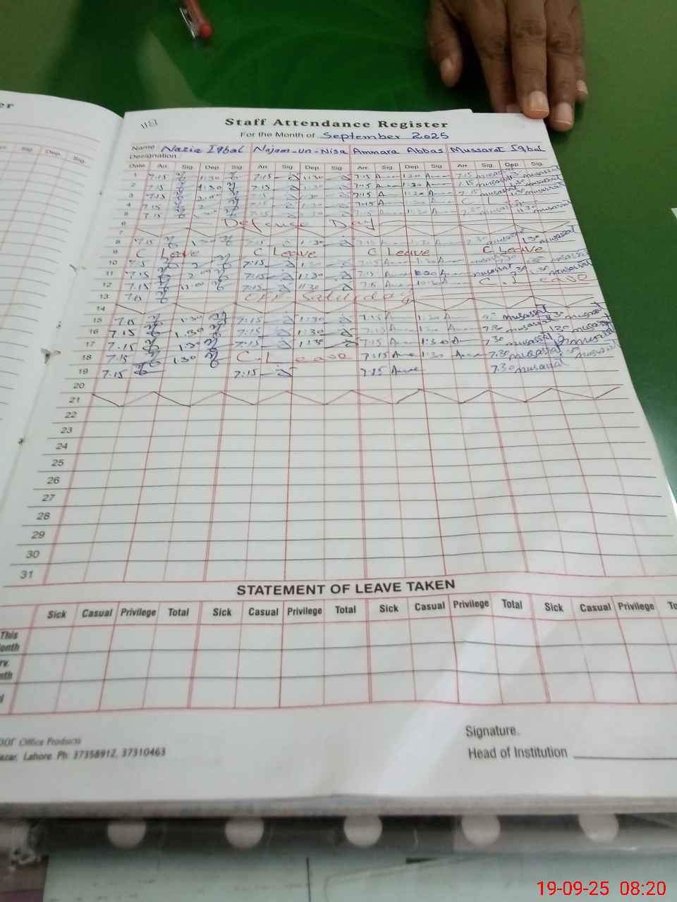 | CNIC | Full Name | Designation | R/C | Absence During Last Calender Month |