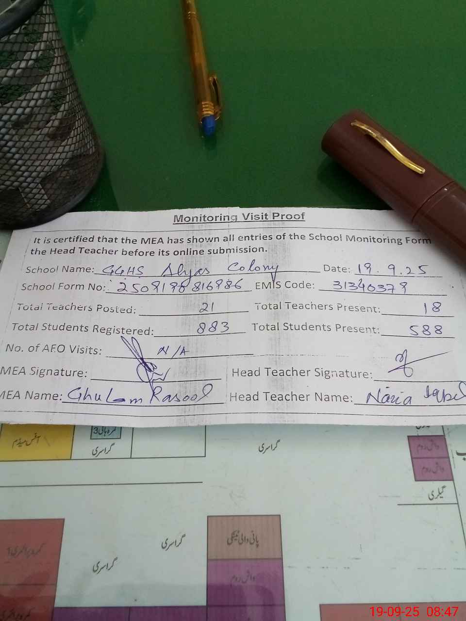 | Attendance Register | Head Teacher | MEA with School | Visit Proof |