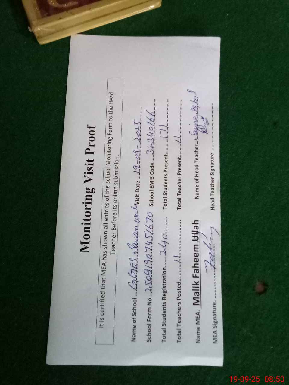 | Attendance Register | Head Teacher | MEA with School | Visit Proof |