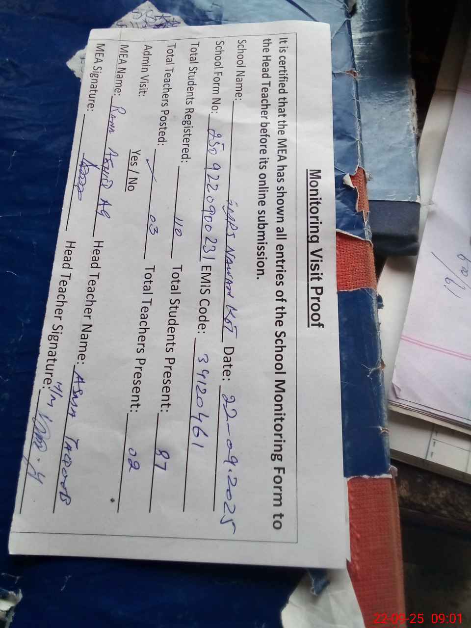 | Attendance Register | Head Teacher | MEA with School | Visit Proof |