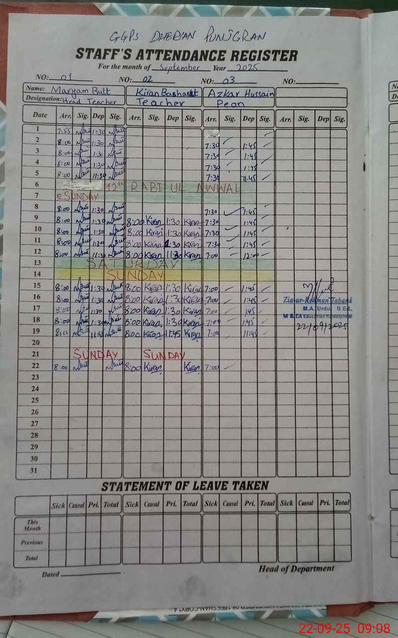 | Attendance Register | Head Teacher | MEA with School | Visit Proof |
