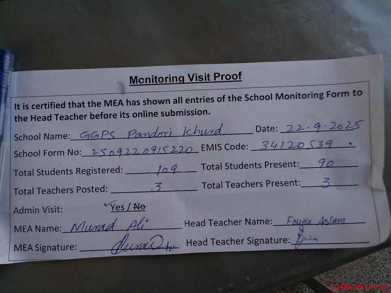 | Attendance Register | Head Teacher | MEA with School | Visit Proof |