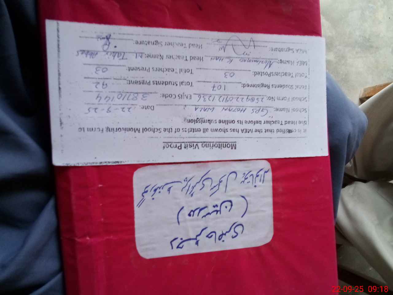 | Attendance Register | Head Teacher | MEA with School | Visit Proof |