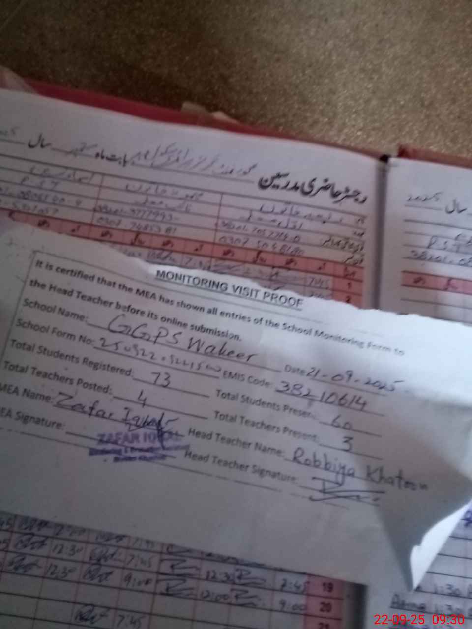 | Attendance Register | Head Teacher | MEA with School | Visit Proof |