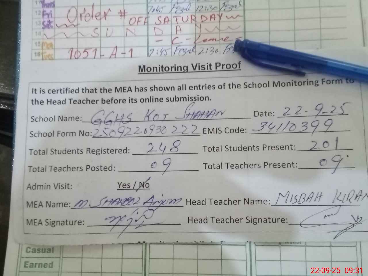| Attendance Register | Head Teacher | MEA with School | Visit Proof |