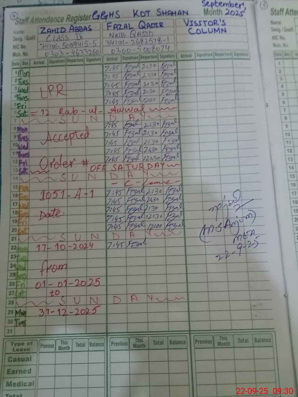 | CNIC | Full Name | Designation | R/C | Absence during last cal. month |