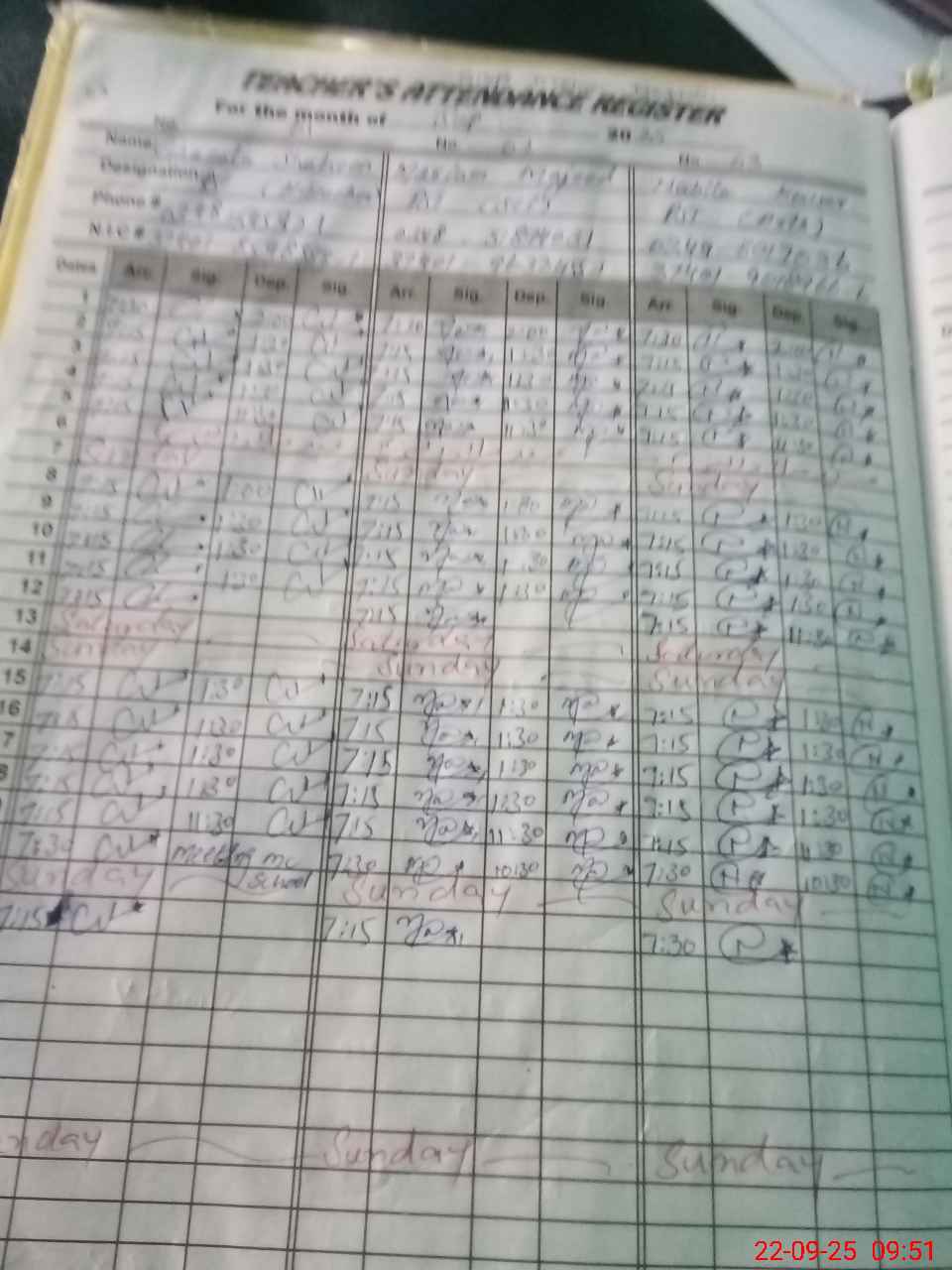 | CNIC | Full Name | Designation | R/C | Absence during last cal. month |