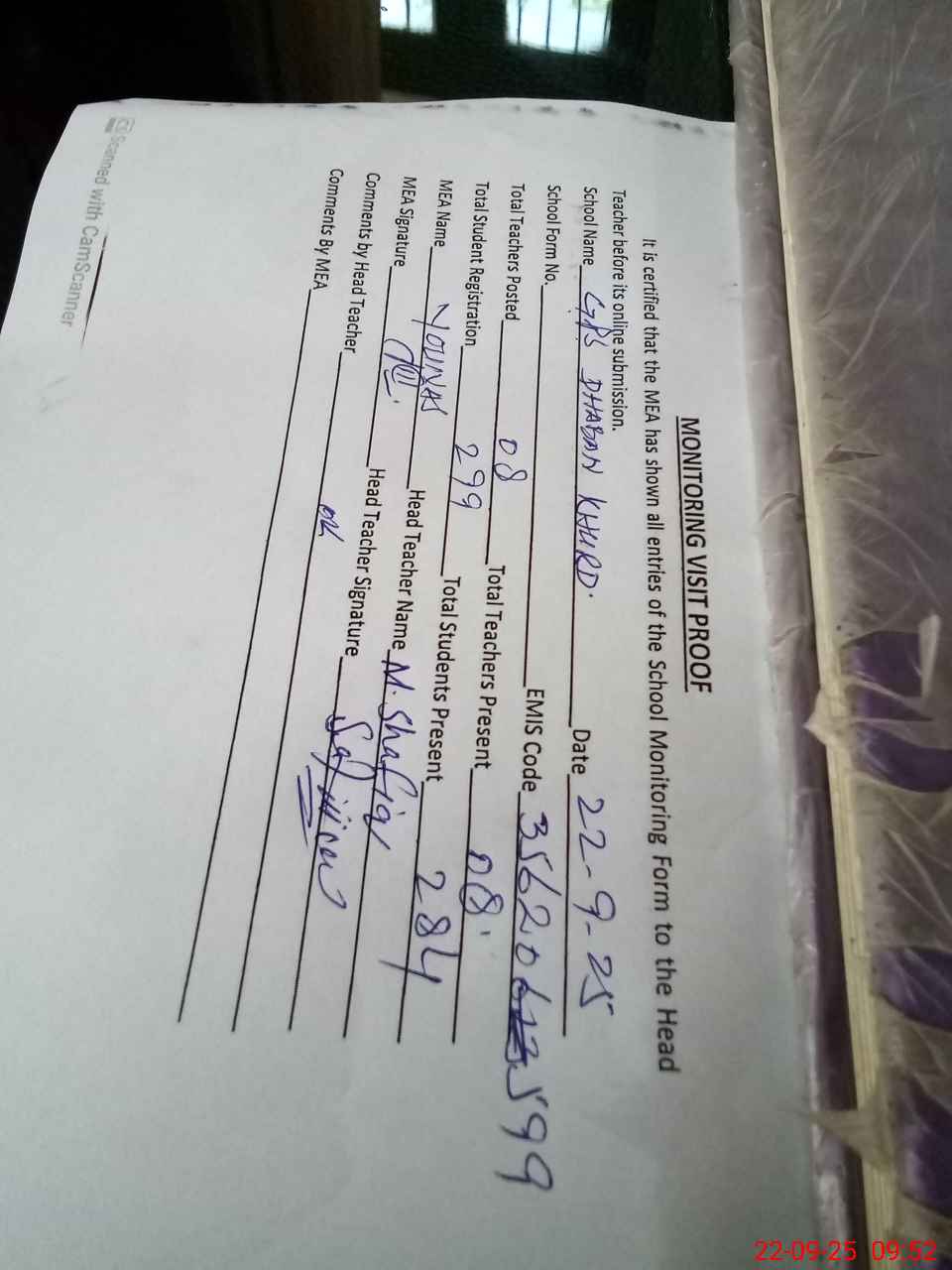 | Attendance Register | Head Teacher | MEA with School | Visit Proof |