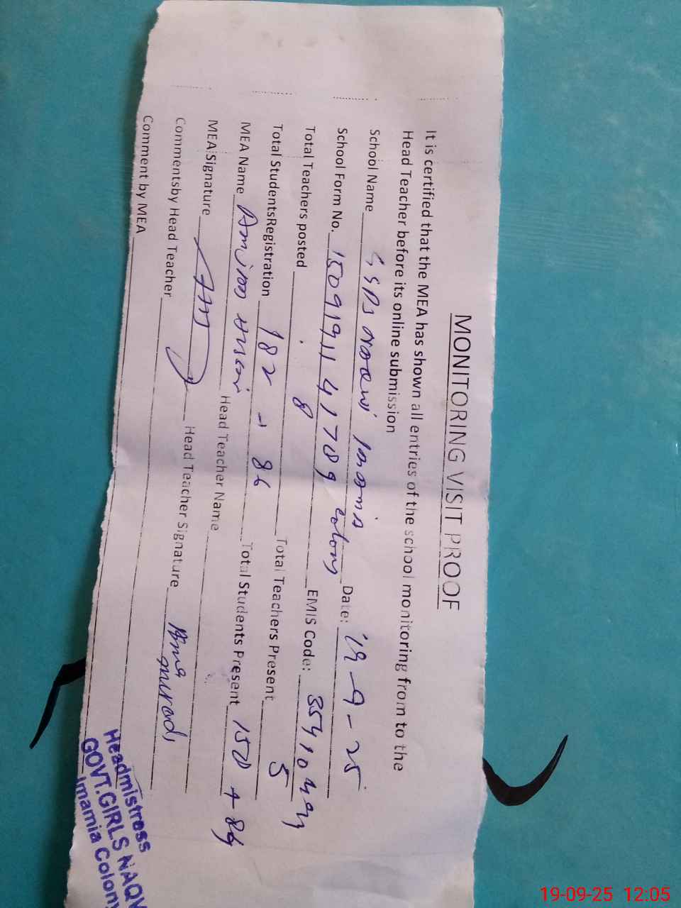 | Attendance Register | Head Teacher | MEA with School | Visit Proof |